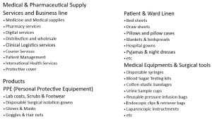 Medical & Pharmaceutical Supply Services and Business line Medicine and Medical supplies Pharmacy services Digital services Distribution and wholesale Clinical Logistics services Courier Services Patient Management International Health Services Protective